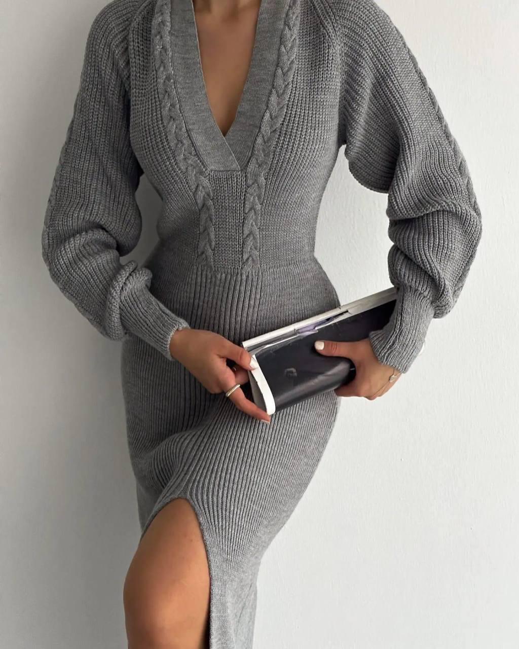 Vestido de punto, largo Midi Abertura en la pierna Ajustado en la cintura Escote en V